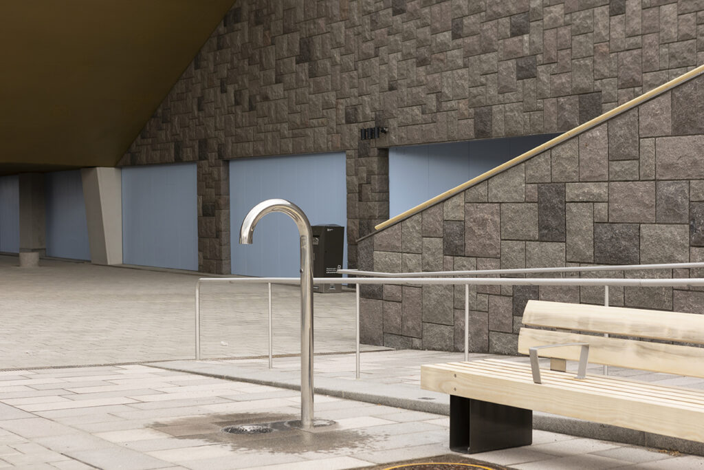 Konstruktionen i polerat rostfritt stål är framtagen med särskild hänsyn till hygien, säkerhet och tillgänglighet. Den är utformad för att minimera bakterieansamling, vara enkel att rengöra och robust nog att tåla påverkan i en offentlig miljö. Munstycke och rörelsesensorer är placerade så att de inte behöver komma i kontakt med användaren. Vattenflödet är konstruerat för att dräneras efter användning, vilket motverkar bakterietillväxt. Utan att utgöra ett hinder i det offentliga rummet är fontänen anpassad för att kunna användas av så många som möjligt, oavsett fysiska förutsättningar.
