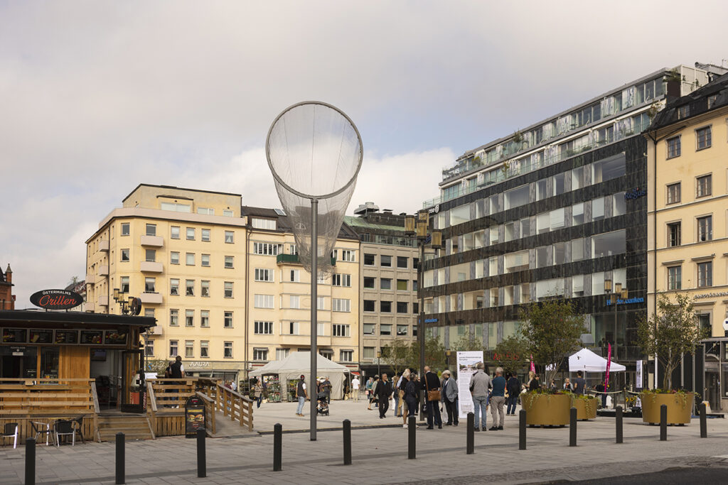 Akane Moriyama, som har sin akademiska bakgrund inom arkitektur och textil, arbetar experimentellt och utmanar traditionella relationer mellan olika konstnärliga discipliner. I sin gestaltning på Östermalmstorg förbinder hon den textila konstens subtilitet med en minimalistisk precision samt förankrar sitt verk i den urbana miljön. Konstverket påminner om en stor, avklippt håv. Den är fäst vid en stång och svajar cirka 8 meter ovanför marken. Konstnärens intention har varit att alla betraktare på varsitt individuella och närmast instinktiva sätt kan knyta an till den till synes anspråkslösa formen.